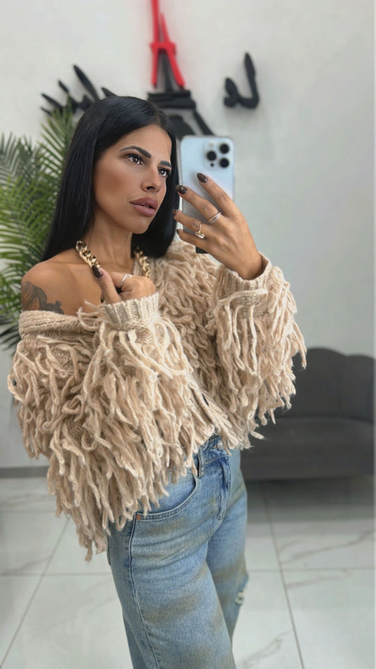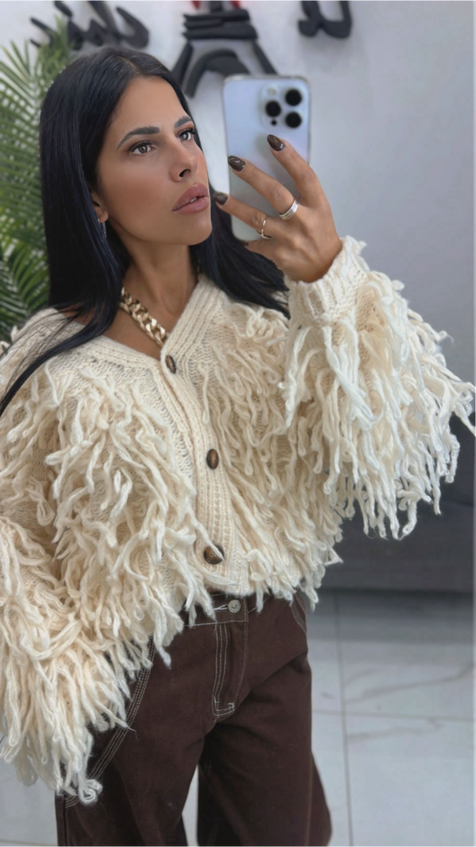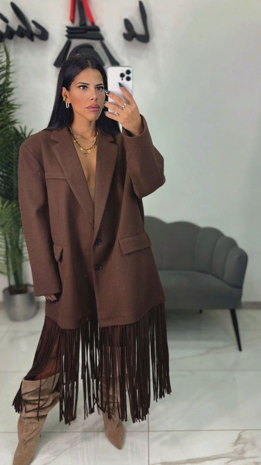 Cappotto con collo a revers.Dettaglio frange sulla lunghezza.Chiusura monopetto con bottoni.Presenti tasche anteriori.Vestibilità oversize, disponibile...