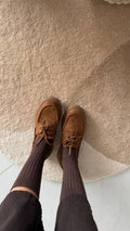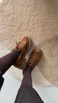 è un mocassino in pelle scamosciata marrone con suola a carro armato.
