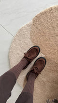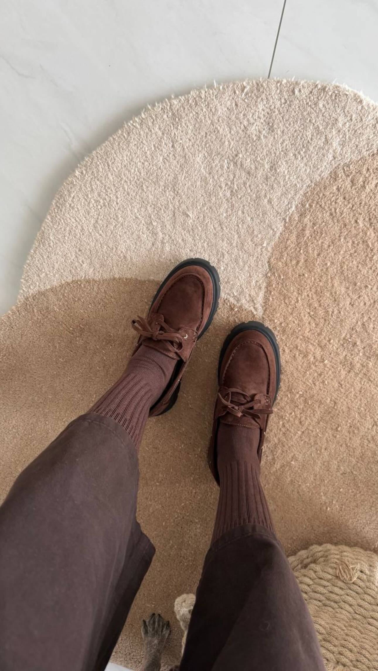 è un mocassino in pelle scamosciata marrone con suola a carro armato.