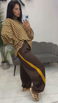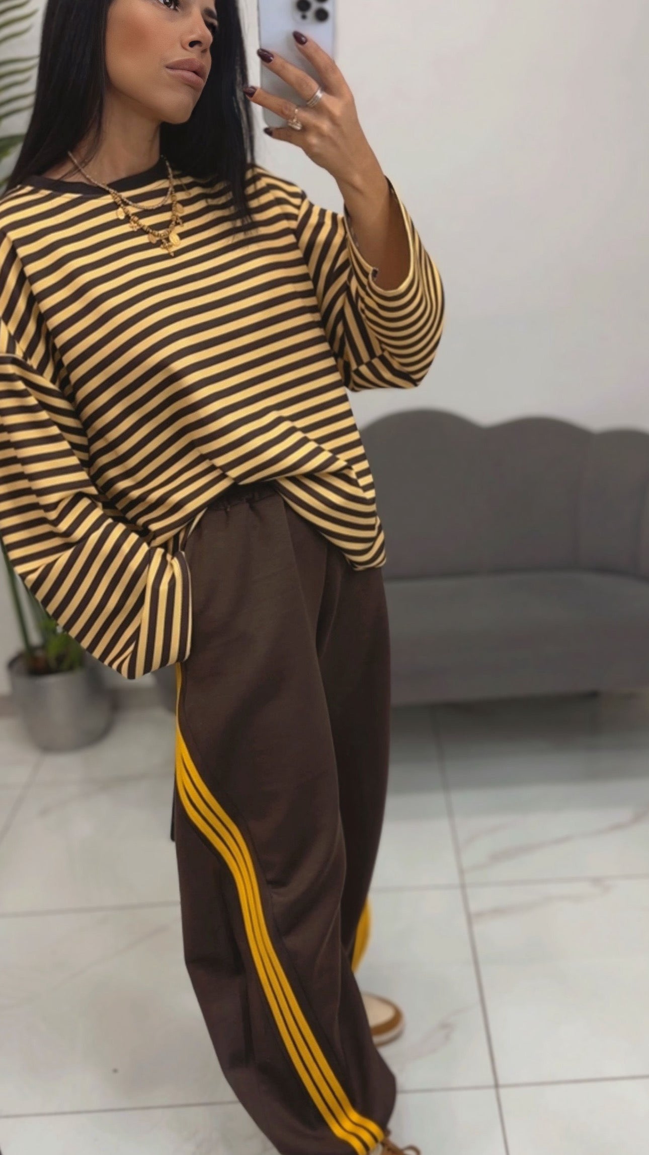 Pantalone Tuta Balloon regolabile alla caviglia colore marrone con righe gialle.