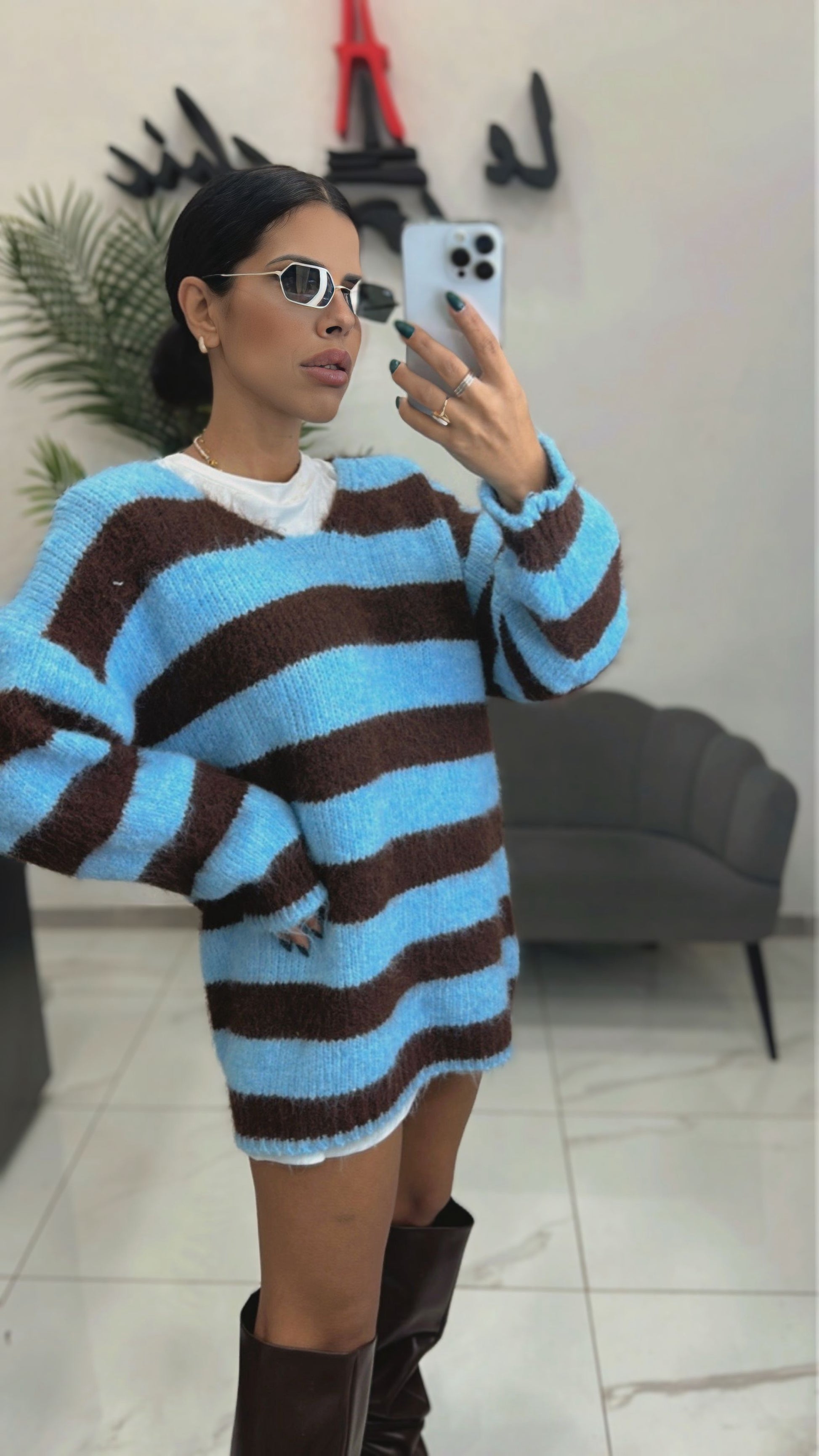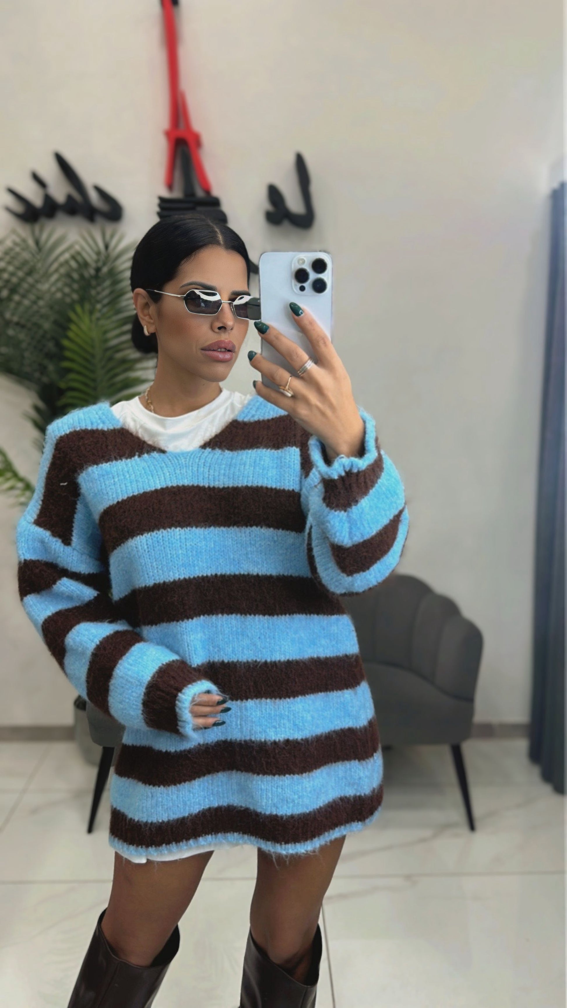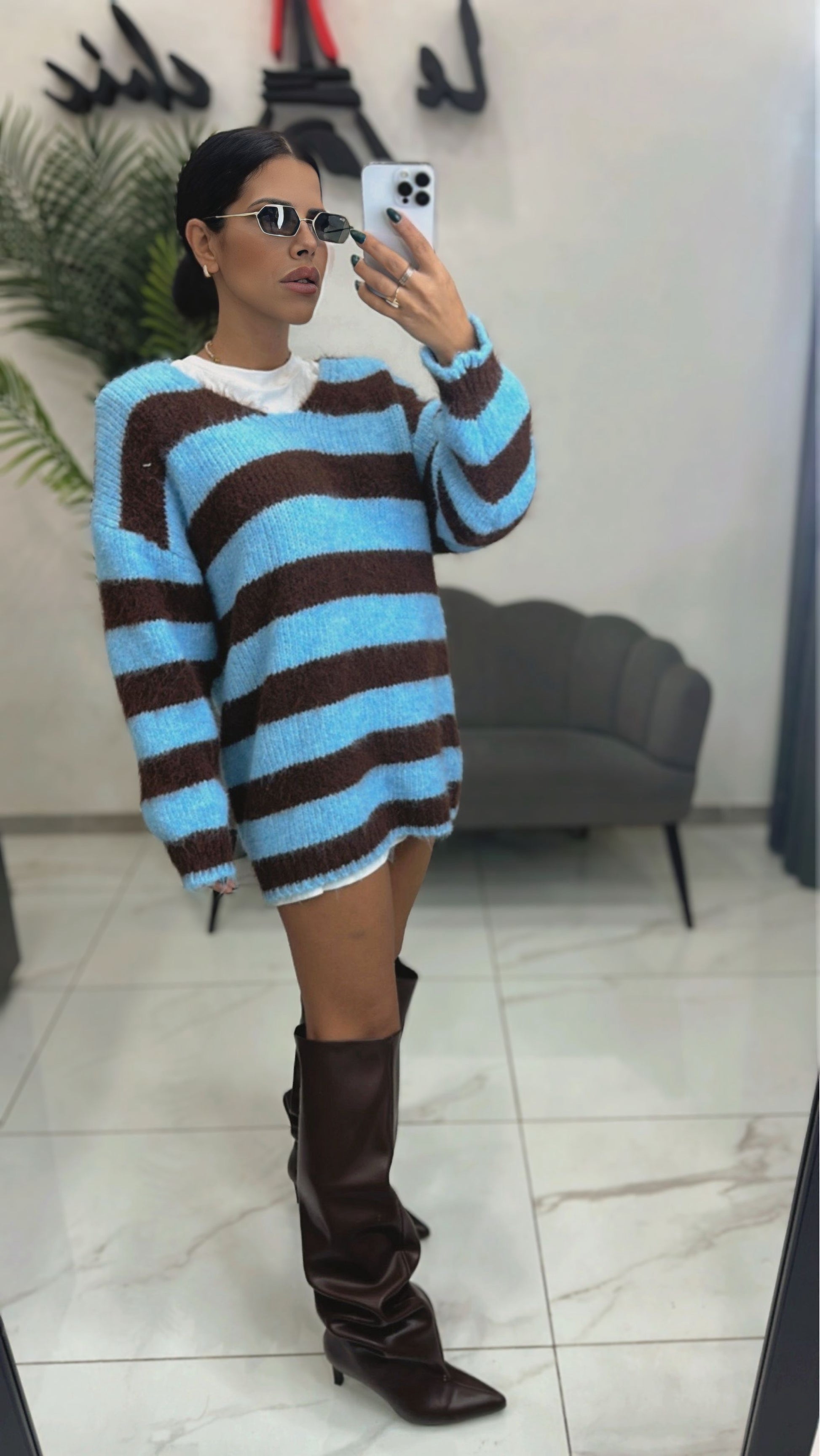 Pullover lungo o mini abito in lana scollo a V a righe