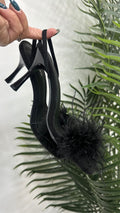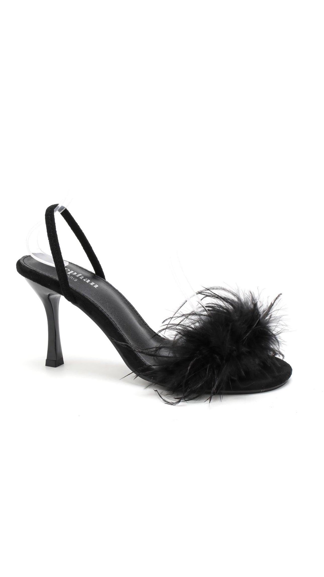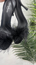 Elegante sandalo con inserto in piuma sintetica sul davanti.