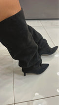 Realizzati in morbido camoscio effetto velluto, questi stivali si distinguono per la loro forma slouchy e la silhouette affusolata che valorizza ogni outfit.