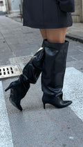 modello sopra il ginocchio con tacco a spillo e punta affusolata.